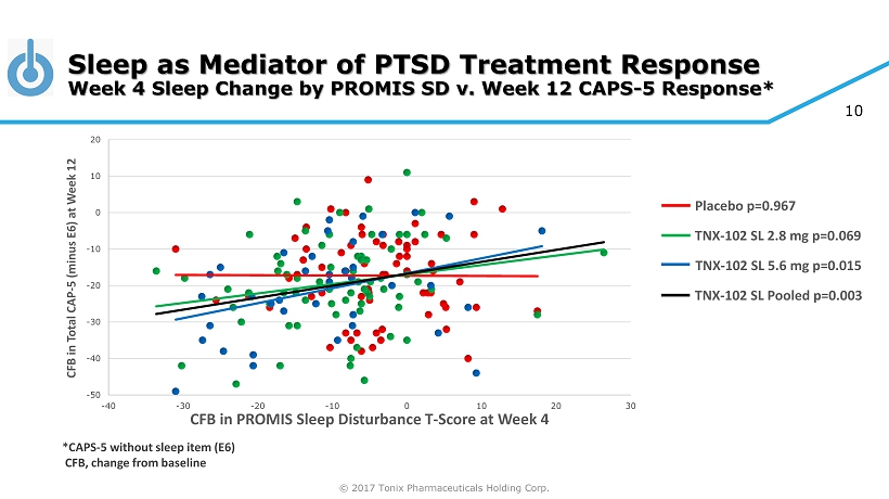 © 2017 Tonix Pharmaceuticals Holding Corp. 9 Sleep as a Mediator of PTSD Treatment Response » Mechanism of action of TNX - 102 SL is hypothesized to be through improvement in sleep quality » Sleep responded early in treatment with TNX - 102 SL, by Week 2 on CAPS - 5 sleep disturbance (SD) item » PROMIS SD instrument administered on Weeks 4, 8 and 12 » In a post hoc analysis, examined the relationship between early response on sleep by PROMIS SD at Week 4 and change in severity of PTSD by the Week 12 endpoint in the three treatment groups (next slide) » For change in severity, used CAPS - 5 total change from baseline without the sleep item (E6) to avoid co - linearity effects between the two variables