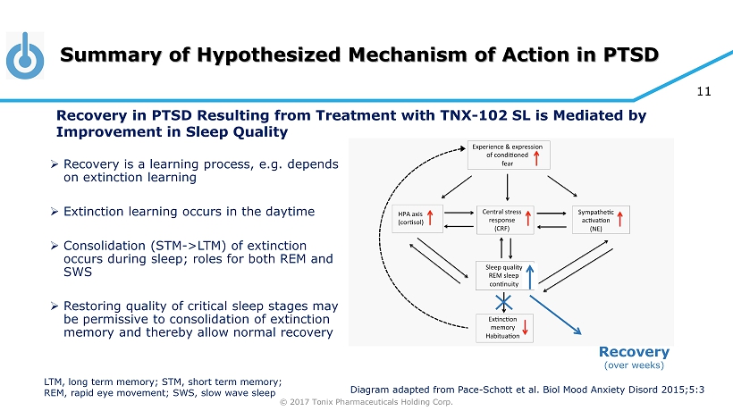 © 2017 Tonix Pharmaceuticals Holding Corp. 10 Sleep as Mediator of PTSD Treatment Response Week 4 Sleep Change by PROMIS SD v. Week 12 CAPS - 5 Response* -50 -40 -30 -20 -10 0 10 20 -40 -30 -20 -10 0 10 20 30 CFB in Total CAP - 5 (minus E6) at Week 12 CFB in PROMIS Sleep Disturbance T - Score at Week 4 Placebo p=0.967 TNX - 102 SL 2.8 mg p=0.069 TNX - 102 SL 5.6 mg p=0.015 TNX - 102 SL Pooled p=0.003 *CAPS - 5 without sleep item (E6) CFB, change from baseline