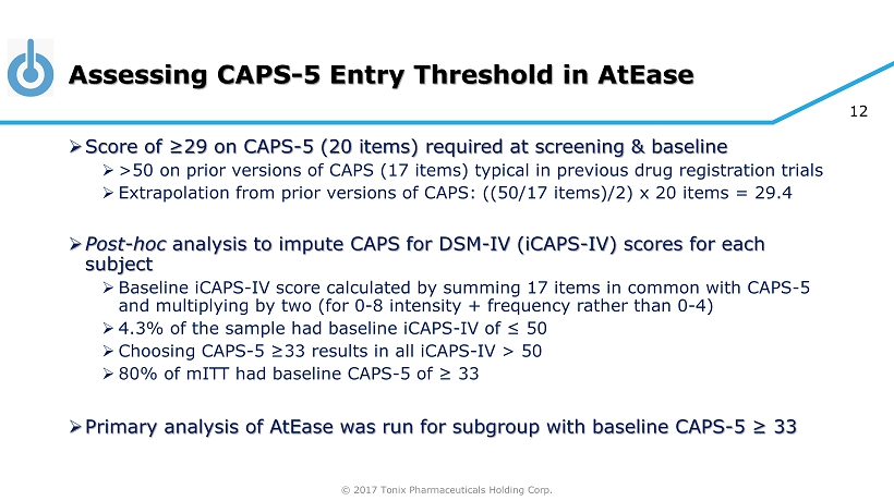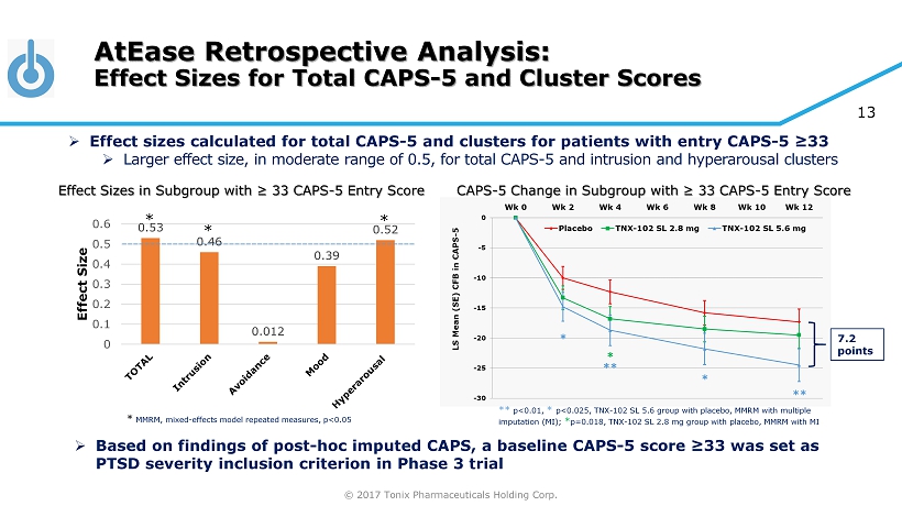 © 2017 Tonix Pharmaceuticals Holding Corp. 12 Assessing CAPS - 5 Entry Threshold in AtEase » Score of ≥29 on CAPS - 5 (20 items) required at screening & baseline » >50 on prior versions of CAPS (17 items) typical in previous drug registration trials » Extrapolation from prior versions of CAPS: ((50/17 items)/2) x 20 items = 29.4 » Post - hoc analysis to impute CAPS for DSM - IV ( iCAPS - IV) scores for each subject » Baseline iCAPS - IV score calculated by summing 17 items in common with CAPS - 5 and multiplying by two (for 0 - 8 intensity + frequency rather than 0 - 4) » 4.3% of the sample had baseline iCAPS - IV of ≤ 50 » Choosing CAPS - 5 ≥33 results in all iCAPS - IV > 50 » 80% of mITT had baseline CAPS - 5 of ≥ 33 » Primary analysis of AtEase was run for subgroup with baseline CAPS - 5 ≥ 33
