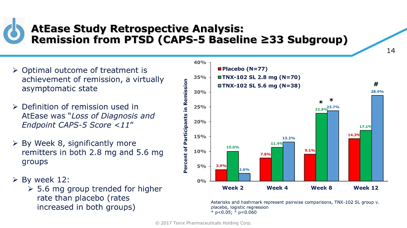 © 2017 Tonix Pharmaceuticals Holding Corp. 13 0.53 0.46 0.012 0.39 0.52 0 0.1 0.2 0.3 0.4 0.5 0.6 Effect Size AtEase Retrospective Analysis: Effect Sizes for Total CAPS - 5 and Cluster Scores * MMRM, mixed - effects model repeated measures, p<0.05 » Effect sizes calculated for total CAPS - 5 and clusters for patients with entry CAPS - 5 ≥33 » Larger effect size, in moderate range of 0.5, for total CAPS - 5 and intrusion and hyperarousal clusters * * * » Based on findings of post - hoc imputed CAPS, a baseline CAPS - 5 score ≥33 was set as PTSD severity inclusion criterion in Phase 3 trial 7.2 points ** p<0.01, * p<0.025, TNX - 102 SL 5.6 group with placebo, MMRM with multiple imputation (MI); * p=0.018, TNX - 102 SL 2.8 mg group with placebo, MMRM with MI Effect Sizes in Subgroup with ≥ 33 CAPS - 5 Entry Score CAPS - 5 Change in Subgroup with ≥ 33 CAPS - 5 Entry Score
