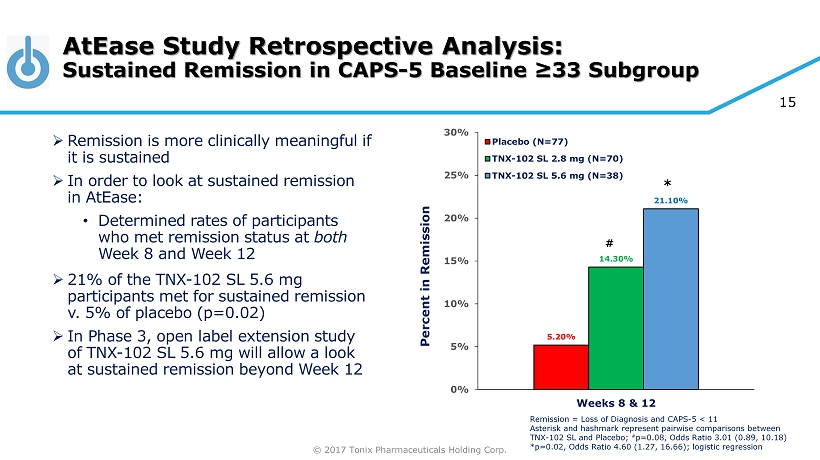 © 2017 Tonix Pharmaceuticals Holding Corp. 14 AtEase Study Retrospective Analysis: Remission from PTSD (CAPS - 5 Baseline ≥33 Subgroup) Asterisks and hashmark represent pairwise comparisons, TNX - 102 SL group v. placebo, logistic regression * p<0.05; # p=0.060 » Optimal outcome of treatment is achievement of remission, a virtually asymptomatic state » Definition of remission used in AtEase was “ Loss of Diagnosis and Endpoint CAPS - 5 Score <11 ” » By Week 8, significantly more remitters in both 2.8 mg and 5.6 mg groups » By week 12: » 5.6 mg group trended for higher rate than placebo (rates increased in both groups) 3.9% 7.8% 9.1% 14.3% 10.0% 11.4% 22.9% 17.1% 2.6% 13.2% 23.7% 28.9% 0% 5% 10% 15% 20% 25% 30% 35% 40% Week 2 Week 4 Week 8 Week 12 Percent of Participants in Remission Placebo (N=77) TNX-102 SL 2.8 mg (N=70) TNX-102 SL 5.6 mg (N=38) # * *