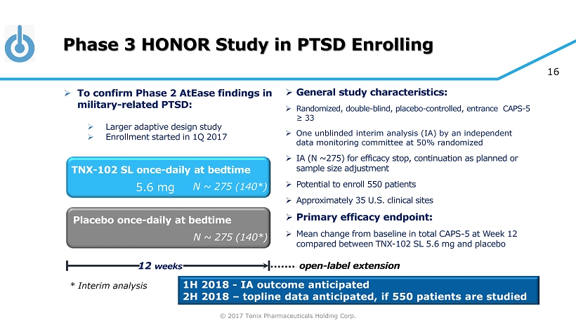© 2017 Tonix Pharmaceuticals Holding Corp. 15 AtEase Study Retrospective Analysis: Sustained Remission in CAPS - 5 Baseline ≥33 Subgroup 5.20% 14.30% 21.10% 0% 5% 10% 15% 20% 25% 30% Weeks 8 & 12 Percent in Remission Placebo (N=77) TNX-102 SL 2.8 mg (N=70) TNX-102 SL 5.6 mg (N=38) # * Remission = Loss of Diagnosis and CAPS - 5 < 11 Asterisk and hashmark represent pairwise comparisons between TNX - 102 SL and Placebo; # p=0.08, Odds Ratio 3.01 (0.89, 10.18) *p=0.02, Odds Ratio 4.60 (1.27, 16.66); logistic regression » Remission is more clinically meaningful if it is sustained » In order to look at sustained remission in AtEase : • Determined rates of participants who met remission status at both Week 8 and Week 12 » 21% of the TNX - 102 SL 5.6 mg participants met for sustained remission v. 5% of placebo (p=0.02) » In Phase 3, open label extension study of TNX - 102 SL 5.6 mg will allow a look at sustained remission beyond Week 12