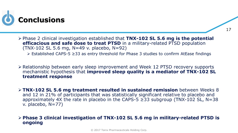 © 2017 Tonix Pharmaceuticals Holding Corp. 16 Phase 3 HONOR Study in PTSD Enrolling » General s tudy c haracteristics: » Randomized, double - blind, placebo - controlled, entrance CAPS - 5 ≥ 33 » One unblinded interim analys i s (IA) by an independent data monitoring committee at 50% randomized » IA (N ~ 275 ) for efficacy stop , continuation as planned or sample size adjustment » Potential to enroll 550 patients » Approximately 3 5 U.S. clinical sites » Primary e fficacy e ndpoint: » Mean change from baseline in total CAPS - 5 at Week 12 compared between TNX - 102 SL 5.6 mg and placebo Placebo once - daily at bedtime 12 weeks TNX - 102 SL once - daily at bedtime N ~ 275 (140*) N ~ 275 (140*) 5.6 mg 1H 2018 - IA outcome anticipated 2H 2018 – topline data anticipated, if 550 patients are studied » To confirm Phase 2 AtEase findings in military - related PTSD: » Larger adaptive design study » Enrollment started in 1Q 2017 * Interim analysis open - label extension