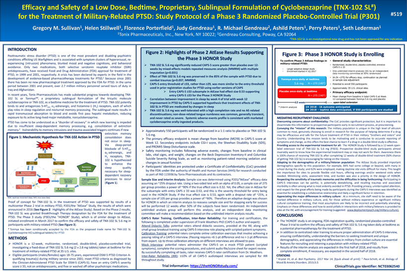 Efficacy and Safety of a Low Dose, Bedtime, Proprietary, Sublingual Formulation of Cyclobenzaprine (TNX - 102 SL # ) for the Treatment of Military - Related PTSD: Study Protocol of a Phase 3 Randomized Placebo - Controlled Trial (P301) Gregory M. Sullivan 1 , Helen Stillwell 1 , Florence Porterfield 1 , Judy Gendreau 1 , R. Michael Gendreau 2 , Ashild Peters 1 , Perry Peters 1 , Seth Lederman 1 1 Tonix Pharmaceuticals, Inc., New York, NY 10022; 2 Gendreau Consulting, Poway, CA 92064 INTRODUCTION Posttraumatic stress disorder (PTSD) is one of the most prevalent and disabling psychiatric conditions afflicting US Warfighters and is associated with symptom clusters of hyperarousal, re - experiencing (intrusion) phenomena, blunted mood and negative cognitions, and behavioral avoidance . Only two medications, both selective serotonin reuptake inhibitor (SSRI) antidepressants, have received Food and Drug Administration (FDA) approval for treatment of PTSD, in 1999 and 2001 , respectively . A crisis has been declared by experts in the field in the development of evidence - based pharmacotherapy treatments for PTSD, 1 because since 2001 there has been no new pharmacological treatment approved by the FDA for PTSD . In the same period between 2001 and present, over 2 . 7 million military personnel served tours of duty in Iraq and Afghanistan . In recent years, Tonix Pharmaceuticals has made substantial progress towards developing TNX - 102 SL or Tonmya® # , a proprietary sublingual formulation of the tricyclic molecule cyclobenzaprine or TNX - 102 , as a bedtime medicine for the treatment of PTSD . TNX - 102 potently binds to and antagonizes 5 - HT 2 A , a 1 - adrenergic, and histamine - 1 (H 1 ) receptors, each of which play roles in sleep regulation and nocturnal memory processing . The sublingual route results in rapid transmucosal absorption to blood and avoids first pass hepatic metabolism, reducing exposure to its active long - lived major metabolite, norcyclobenzaprine . PTSD has come to be understood as a “disorder of recovery” in which new learning is impeded due to insufficient sleep - dependent memory processing, e . g . consolidation of extinction memory . 2 Vulnerability to memory intrusions and trauma - associated triggers continues if new METHODS » HONOR is a 12 - week, multicenter, randomized, double - blind, placebo - controlled trial, investigating a fixed - dose of TNX - 102 SL 5 . 6 mg ( 2 x 2 . 8 mg tablets) taken at bedtime for the treatment of military - related PTSD at 35 U . S . sites . » Eligible participants (males/females) ages 18 - 75 years, experienced DSM - 5 PTSD Criterion A - qualifying trauma(s) during military service since 2001 ; meet PTSD criteria as diagnosed by the Clinician - Administered PTSD Scale for DSM - 5 (CAPS - 5 ) ; have an entry CAPS - 5 severity score ≥ 33 , not on antidepressants, and free or washed off other psychotropic medications . ClinicalTrials.gov Identifier: NCT03062540 # TNX - 102 SL is an investigational new drug and has not been approved for any indication CONCLUSIONS » The ‘HONOR’ study is an ongoing, FDA - registration quality, randomized placebo - controlled Phase 3 trial to confirm the efficacy and safety of TNX - 102 SL 5.6 mg taken daily at bedtime as a potential pharmacotherapy for the treatment of PTSD. » In addition to centralized rater training to ensure proper administration of CAPS - 5 interview, ensuring confidentiality, understanding the barriers to seeking treatment and unique demographics, and appreciating the differences in military from civilian culture are essential features for recruiting and retaining a population with military - related PTSD. » Results of the interim analysis are expected in the first half of 2018, and results from complete enrollment, if necessary, are expected in the second half of 2018. MEDIATING RECRUITMENT CHALLENGES Overcoming concerns about confidentiality : The CoC provides significant protection, but it is important to disseminate this information to prospective participants early in recruitment process, at prescreening . Conveying the “mission” of this research : The military population is unique in the high level of altruism common to most, genuinely choosing to enroll in research for the purpose of helping determine if a drug may be efficacious and safe for the future treatment of PTSD in their military “brothers and sisters” and Country . Understanding this mission tends to be motivating and is conducive to accurate reporting of symptoms and change, as this offers the best chance to learn if a drug in a double - blind study is effective . Providing access to the experimental treatment for all : The HONOR Study is followed by a 12 - week open - label extension trial of TNX - 102 SL 5 . 6 mg (P 303 ) . Prospective double - blind study participants almost invariably want to know how the experimental treatment may or may not work for them . Awareness there is 100 % chance of receiving TNX - 102 SL after completing 12 weeks of double - blind treatment ( 50 % chance of getting TNX - 102 SL) is encouraging for taking on the mission . Adapting to the demographics of a military/Veteran population : The AtEase Study provided important demographics specific to this population . For example, 84 % had some college or beyond, with many in school during the study ; and 62 % were employed, making daytime site visits difficult for many . This taught the importance for sites to provide flexible visit hours, offering evenings and/or weekend visits when needed . Minimizing visits, assessment time, and burden was also a priority in the design of HONOR . Respecting the sensitivity of traumatic memories and the difficulties in being forthcoming : Participating in CAPS - 5 interviews can be painful, is potentially destabilizing, and recalling traumas and associated morbidity is often among what is most ardently avoided in PTSD . Providing privacy, uninterrupted attention, and respect f