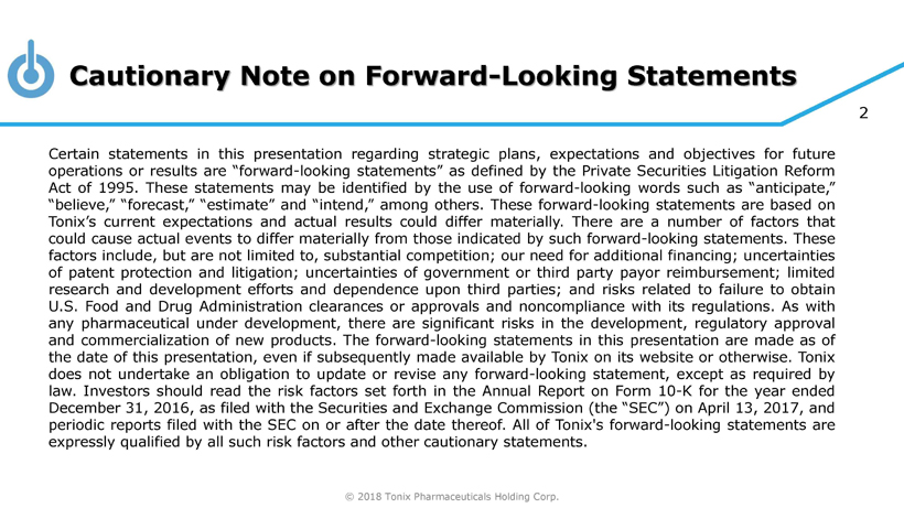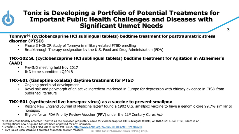 © 2018 Tonix Pharmaceuticals Holding Corp. 2 Cautionary Note on Forward - Looking Statements Certain statements in this presentation regarding strategic plans, expectations and objectives for future operations or results are “forward - looking statements” as defined by the Private Securities Litigation Reform Act of 1995 . These statements may be identified by the use of forward - looking words such as “anticipate,” “believe,” “forecast,” “estimate” and “intend,” among others . These forward - looking statements are based on Tonix’s current expectations and actual results could differ materially . There are a number of factors that could cause actual events to differ materially from those indicated by such forward - looking statements . These factors include, but are not limited to, substantial competition ; our need for additional financing ; uncertainties of patent protection and litigation ; uncertainties of government or third party payor reimbursement ; limited research and development efforts and dependence upon third parties ; and risks related to failure to obtain U . S . Food and Drug Administration clearances or approvals and noncompliance with its regulations . As with any pharmaceutical under development, there are significant risks in the development, regulatory approval and commercialization of new products . The forward - looking statements in this presentation are made as of the date of this presentation, even if subsequently made available by Tonix on its website or otherwise . Tonix does not undertake an obligation to update or revise any forward - looking statement, except as required by law . Investors should read the risk factors set forth in the Annual Report on Form 10 - K for the year ended December 31 , 2016 , as filed with the Securities and Exchange Commission (the “SEC”) on April 13 , 2017 , and periodic reports filed with the SEC on or after the date thereof . All of Tonix's forward - looking statements are expressly qualified by all such risk factors and other cautionary statements .