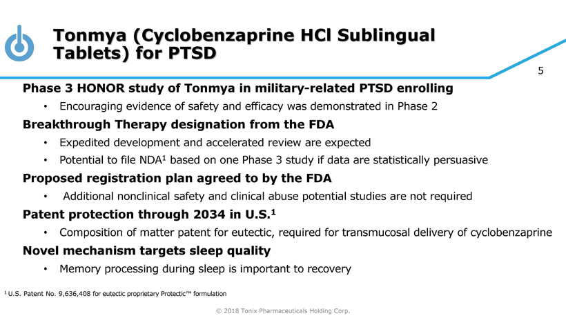 © 2018 Tonix Pharmaceuticals Holding Corp. 4 Products in Development Preclinical Phase 2 NDA 1 /BLA 2 Market Pipeline Product Indication/ Description Phase 3 Tonmya Bedtime Treatment for PTSD Daytime Treatment for PTSD TNX - 601 Novel polymorph and salt discovered and characterized TNX - 801 Horsepox virus synthesized and demonstrated protective vaccine activity in mice Smallpox - preventing vaccine Cyclobenzaprine HCl sublingual tablets Tianeptine oxalate oral formulation Live horsepox virus (HPXV) vaccine from cell culture Phase 1 Phase 2 AtEase results reported May 2016 Phase 3 HONOR began enrollment in 1Q2017 1 NDA - New Drug Application; 2 BLA – Biologic Licensing Application; 3 Investigational New Drug Application Bedtime Treatment for Agitation in Alzheimer’s Cyclobenzaprine HCl sublingual tablets FDA Pre - IND 3 meeting Held Nov 2017 TNX - 102 SL All programs owned outright with no royalties or other obligations due