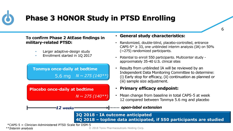 © 2018 Tonix Pharmaceuticals Holding Corp. 5 Tonmya (Cyclobenzaprine HCl Sublingual Tablets) for PTSD Phase 3 HONOR study of Tonmya in military - related PTSD enrolling • Encouraging evidence of safety and efficacy was demonstrated in Phase 2 Breakthrough Therapy designation from the FDA • Expedited development and accelerated review are expected • Potential to file NDA 1 based on one Phase 3 study if data are statistically persuasive Proposed registration plan agreed to by the FDA • Additional nonclinical safety and clinical abuse potential studies are not required Patent protection through 2034 in U.S. 1 • Composition of matter patent for eutectic, required for transmucosal delivery of cyclobenzaprine Novel mechanism targets sleep quality • Memory processing during sleep is important to recovery 1 U.S. Patent No. 9,636,408 for eutectic proprietary Protectic ™ formulation