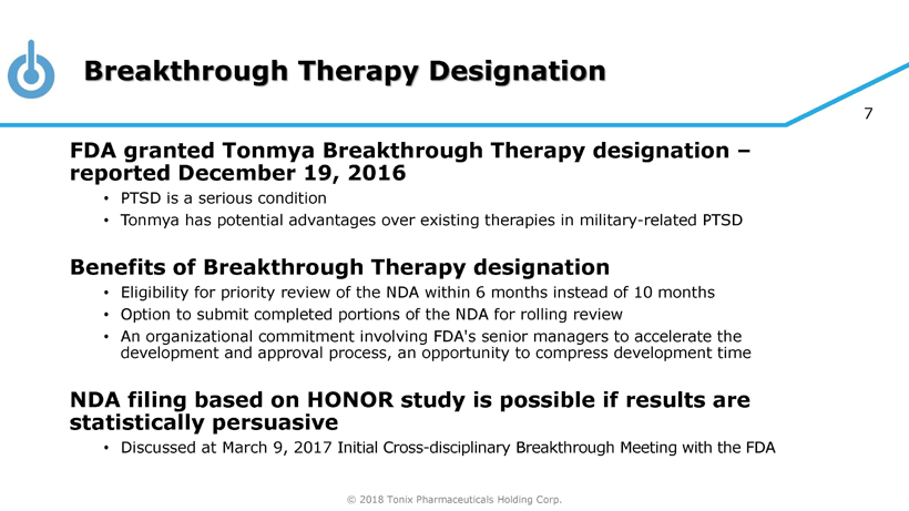 © 2018 Tonix Pharmaceuticals Holding Corp. 6 Phase 3 HONOR Study in PTSD Enrolling • General s tudy c haracteristics: • Randomized, double - blind, placebo - controlled, entrance CAPS - 5 * ≥ 33 , one unblinded interim analysis (IA) on 50% (~275) randomized participants. • P otential to enroll 550 participants. Multicenter study - approximately 35 - 40 U.S. clinical sites • Results from unblinded IA will be reviewed by an Independent Data Monitoring Committee to determine: ( i ) Early stop for efficacy, (ii) continuation as planned or (iii) sample size adjustment. • Primary e fficacy e ndpoint: • Mean change from baseline in total CAPS - 5 at w eek 12 compared between Tonmya 5.6 mg and placebo Placebo once - daily at bedtime 12 weeks Tonmya once - daily at bedtime N ~ 275 (140**) N ~ 275 (140**) 5.6 mg 3Q 2018 - IA outcome anticipated 4Q 2018 – topline data anticipated, if 550 participants are studied To confirm Phase 2 AtEase findings in military - related PTSD: • Larger adaptive - design study • Enrollment started in 1Q 2017 **Interim analysis open - label extension *CAPS - 5 = Clinician - Administered PTSD Scale for DSM - 5
