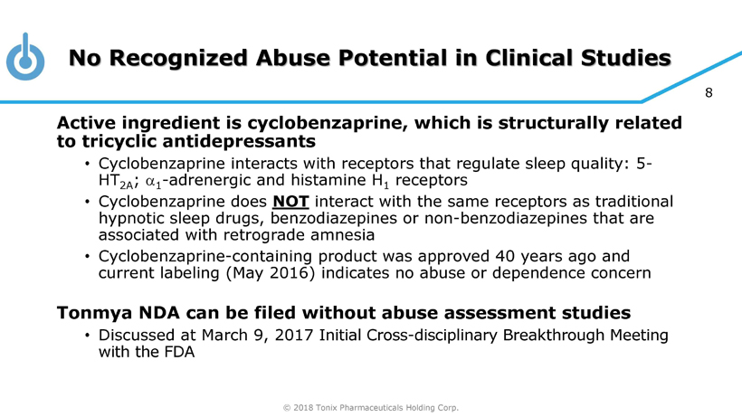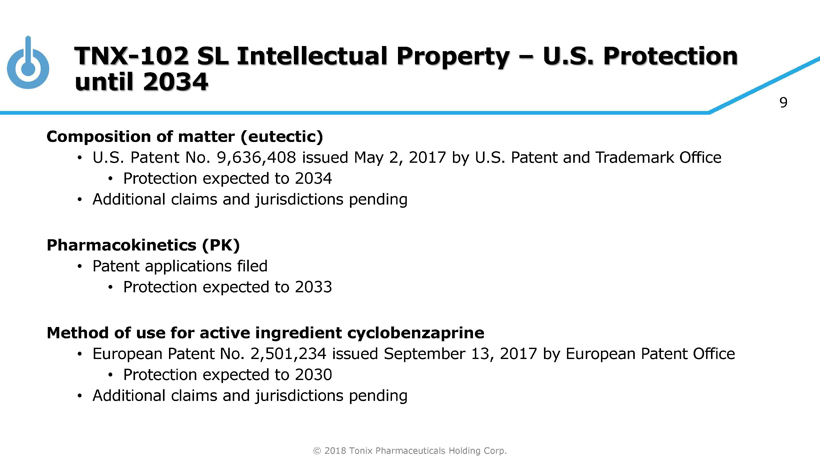 © 2018 Tonix Pharmaceuticals Holding Corp. 8 No Recognized Abuse Potential in Clinical Studies Active ingredient is cyclobenzaprine, which is structurally related to tricyclic antidepressants • Cyclobenzaprine interacts with receptors that regulate sleep quality: 5 - HT 2A ; a 1 - adrenergic and histamine H 1 receptors • Cyclobenzaprine does NOT interact with the same receptors as traditional hypnotic sleep drugs, benzodiazepines or non - benzodiazepines that are associated with retrograde amnesia • Cyclobenzaprine - containing product was approved 40 years ago and current labeling (May 2016) indicates no abuse or dependence concern Tonmya NDA can be filed without abuse assessment studies • Discussed at March 9, 2017 Initial Cross - disciplinary Breakthrough Meeting with the FDA