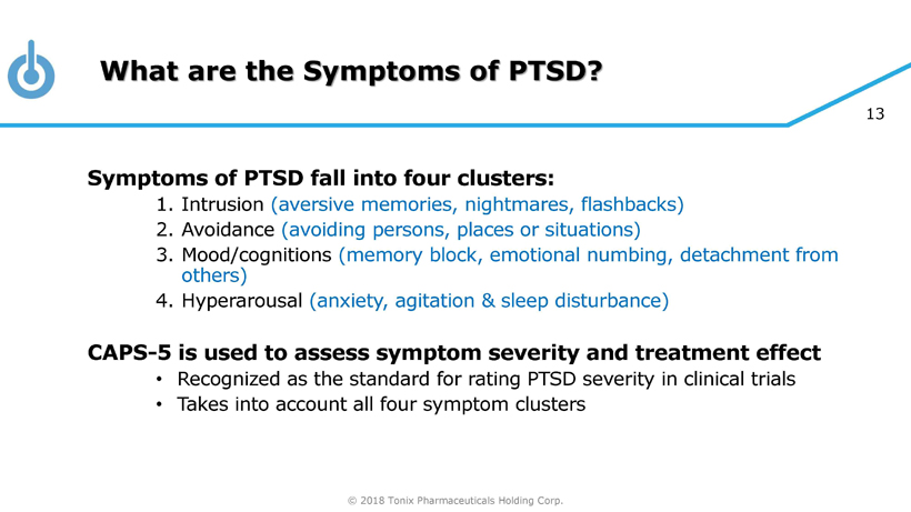 © 2018 Tonix Pharmaceuticals Holding Corp. 12 Tonmya : Novel Mechanism Targets Sleep Quality for Recovery from PTSD PTSD is a disorder of recovery • Most people exposed to extreme trauma recover over a few weeks • In PTSD, recovery process impeded due to insufficient sleep - dependent memory processing Memory processing is essential to recovery • Vulnerability to memory intrusions and trauma triggers remains if no consolidation of new learning (extinction) Tonmya targets sleep quality 1 • Cyclobenzaprine interacts with receptors that regulate sleep quality: strongly binds and potently blocks 5 - HT 2A , a 1 - adrenergic and histamine H 1 receptors, permissive to sleep - dependent recovery processes 1 Daugherty et al., Abstract 728, Society of Biological Psychiatry 70th Annual Scientific Convention, May 14 - 16, 2015, Toronto Ont ario, Canada