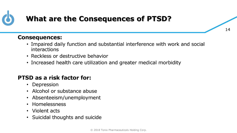 © 2018 Tonix Pharmaceuticals Holding Corp. 13 What are the Symptoms of PTSD? Symptoms of PTSD fall into four clusters: 1. Intrusion (aversive memories, nightmares, flashbacks) 2. Avoidance (avoiding persons, places or situations) 3. Mood/cognitions (memory block, emotional numbing, detachment from others) 4. Hyperarousal (anxiety, agitation & sleep disturbance) CAPS - 5 is used to assess symptom severity and treatment effect • Recognized as the standard for rating PTSD severity in clinical trials • Takes into account all four symptom clusters