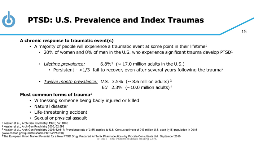 © 2018 Tonix Pharmaceuticals Holding Corp. 14 What are the Consequences of PTSD? Consequences: • Impaired daily function and substantial interference with work and social interactions • Reckless or destructive behavior • Increased health care utilization and greater medical morbidity PTSD as a risk factor for: • Depression • Alcohol or substance abuse • Absenteeism/unemployment • Homelessness • Violent acts • Suicidal thoughts and suicide
