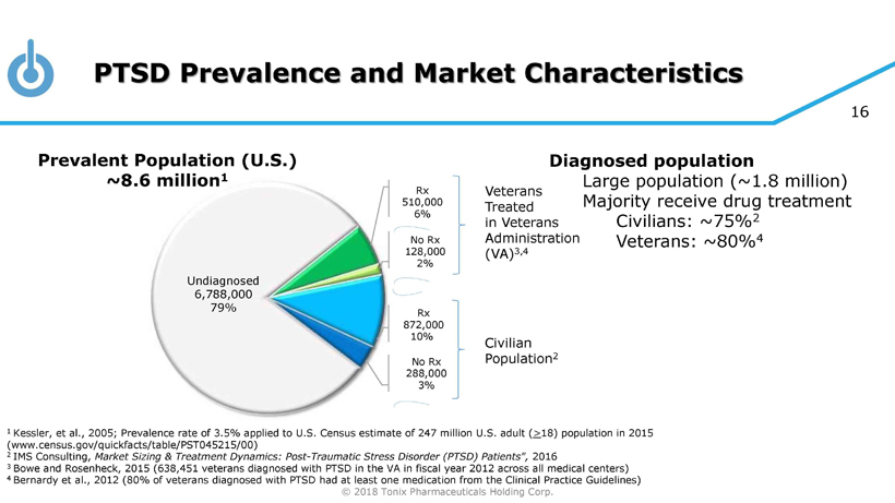 © 2018 Tonix Pharmaceuticals Holding Corp. 15 PTSD: U.S. Prevalence and Index Traumas A chronic response to traumatic event(s) • A majority of people will experience a traumatic event at some point in their lifetime 1 • 20% of women and 8% of men in the U.S. who experience significant trauma develop PTSD 1 • Lifetime prevalence: 6.8% 2 (~ 17.0 million adults in the U.S.) • Persistent - >1/3 fail to recover, even after several years following the trauma 2 • Twelve month prevalence: U.S. 3.5% (~ 8.6 million adults) 3 EU 2.3% (~10.0 million adults) 4 Most common forms of trauma 1 • Witnessing someone being badly injured or killed • Natural disaster • Life - threatening accident • Sexual or physical assault 1 Kessler et al., Arch Gen Psychiatry 1995; 52:1048 2 Kessler et al., Arch Gen Psychiatry 2005; 62:593 3 Kessler et al., Arch Gen Psychiatry 2005 ; 62:617 ; Prevalence rate of 3.5% applied to U.S. Census estimate of 247 million U.S. adult ( > 18) population in 2015 (www.census.gov/quickfacts/table/PST045215/00) 4 The European Union Market Potential for a New PTSD Drug. Prepared for Tonix Pharmaceuticals by Procela Consultants Ltd, Sept emb er 2016
