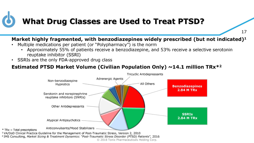 © 2018 Tonix Pharmaceuticals Holding Corp. 16 PTSD Prevalence and Market Characteristics 1 Kessler, et al., 2005; Prevalence rate of 3.5% applied to U.S. Census estimate of 247 million U.S. adult ( > 18) population in 2015 (www.census.gov/quickfacts/table/PST045215/00) 2 IMS Consulting, Market Sizing & Treatment Dynamics: Post - Traumatic Stress Disorder (PTSD) Patients", 2016 3 Bowe and Rosenheck , 2015 (638,451 veterans diagnosed with PTSD in the VA in fiscal year 2012 across all medical centers) 4 Bernardy et al., 2012 (80% of veterans diagnosed with PTSD had at least one medication from the Clinical Practice Guidelines) Veterans Treated in Veterans Administration (VA) 3,4 Civilian Population 2 Diagnosed population Large population (~1.8 million) Majority receive drug treatment Civilians: ~75% 2 Veterans: ~80% 4 Undiagnosed 6,788,000 79% Prevalent Population (U.S.) ~8.6 million 1 Rx 510,000 6% No Rx 128,000 2% Rx 872,000 10% No Rx 288,000 3%