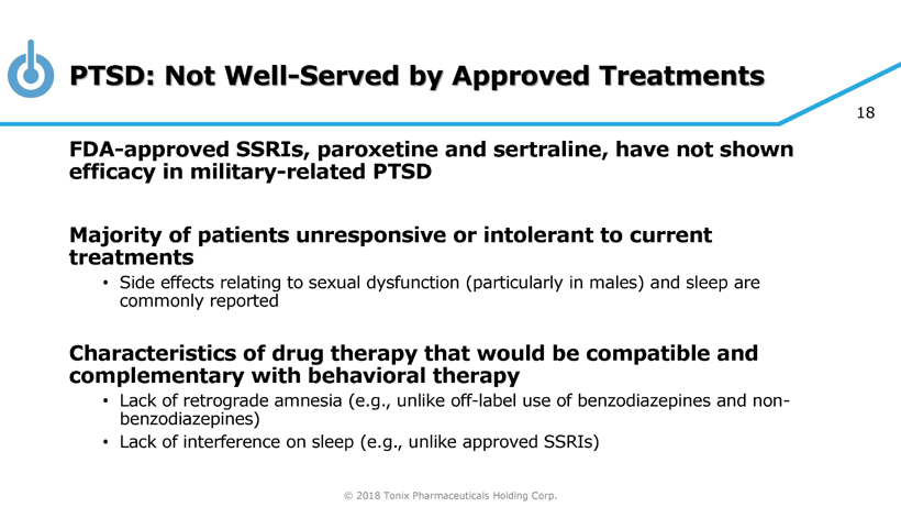 © 2018 Tonix Pharmaceuticals Holding Corp. 17 What Drug Classes are Used to Treat PTSD? * TRx = Total prescriptions 1 VA/DoD Clinical Practice Guideline for the Management of Post - Traumatic Stress, Version 2, 2010 2 IMS Consulting, Market Sizing & Treatment Dynamics: “Post - Traumatic Stress Disorder (PTSD) Patients", 2016 Benzodiazepines 2.84 M TRx SSRIs 2.84 M TRx Other Antidepressants Non - benzodiazepine Hypnotics Serotonin and norepinephrine reuptake inhibitors (SNRIs) Tricyclic Antidepressants Adrenergic Agents All Others Atypical Antipsychotics Anticonvulsants/Mood Stabilizers Market highly fragmented, with benzodiazepines widely prescribed (but not indicated) 1 • Multiple medications per patient (or “Polypharmacy”) is the norm • Approximately 55% of patients receive a benzodiazepine, and 53% receive a selective serotonin reuptake inhibitor (SSRI) • SSRIs are the only FDA - approved drug class Estimated PTSD Market Volume (Civilian Population Only) ~14.1 million TRx * 2