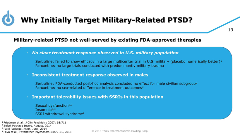 © 2018 Tonix Pharmaceuticals Holding Corp. 18 PTSD: Not Well - Served by Approved Treatments FDA - approved SSRIs, paroxetine and sertraline, have not shown efficacy in military - related PTSD Majority of patients unresponsive or intolerant to current treatments • Side effects relating to sexual dysfunction (particularly in males) and sleep are commonly reported Characteristics of drug therapy that would be compatible and complementary with behavioral therapy • Lack of retrograde amnesia (e.g., unlike off - label use of benzodiazepines and non - benzodiazepines) • Lack of interference on sleep (e.g., unlike approved SSRIs)