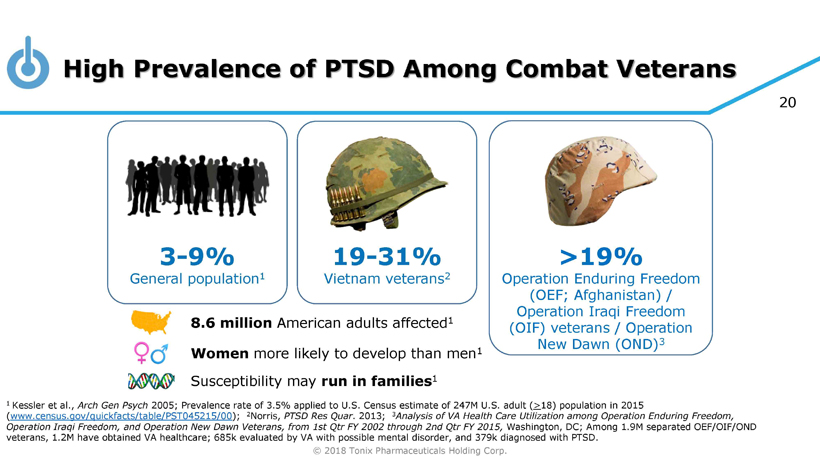 © 2018 Tonix Pharmaceuticals Holding Corp. 19 Why Initially Target Military - Related PTSD? 1 Friedman et al., J Clin Psychiatry 2007; 68:711 2 Zoloft Package Insert, August, 2014 3 Paxil Package Insert, June, 2014 4 Fava et al., Psychother Psychosom 84:72 - 81, 2015 Military - related PTSD not well - served by existing FDA - approved therapies • No clear treatment response observed in U.S. military population Sertraline: failed to show efficacy in a large multicenter trial in U.S. military (placebo numerically better) 1 Paroxetine: no large trials conducted with predominantly military trauma • Inconsistent treatment response observed in males Sertraline: FDA - conducted post - hoc analysis concluded no effect for male civilian subgroup 2 Paroxetine: no sex - related difference in treatment outcomes 3 • Important tolerability issues with SSRIs in this population Sexual dysfunction 2,3 Insomnia 2,3 SSRI withdrawal syndrome 4