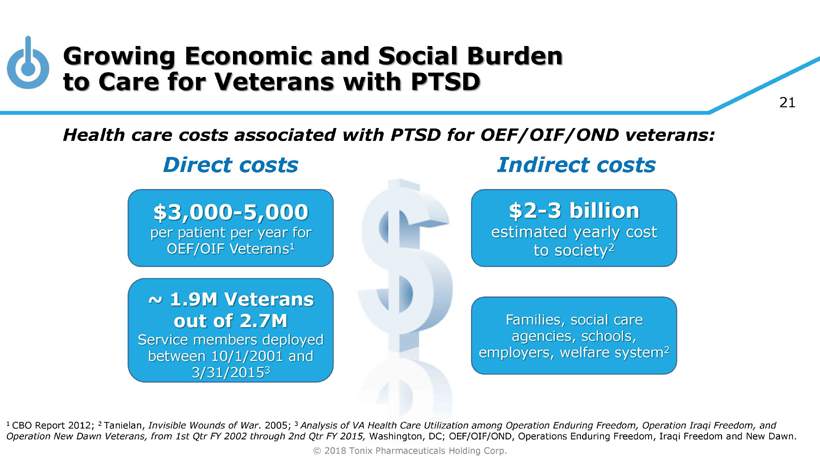 © 2018 Tonix Pharmaceuticals Holding Corp. 20 High Prevalence of PTSD Among Combat Veterans 1 Kessler et al., Arch Gen Psych 2005; Prevalence rate of 3.5% applied to U.S. Census estimate of 247M U.S. adult ( > 18) population in 2015 ( www.census.gov/quickfacts/table/PST045215/00 ) ; 2 Norris, PTSD Res Quar . 2013; 3 Analysis of VA Health Care Utilization among Operation Enduring Freedom, Operation Iraqi Freedom, and Operation New Dawn Veterans, from 1st Qtr FY 2002 through 2nd Qtr FY 2015, Washington, DC ; Among 1.9M separated OEF/OIF/OND veterans, 1.2M have obtained VA healthcare; 685k evaluated by VA with possible mental disorder, and 379k diagnosed with PTSD. >19% Operation Enduring Freedom (OEF; Afghanistan) / Operation Iraqi Freedom (OIF) veterans / Operation New Dawn (OND) 3 3 - 9% General population 1 19 - 31% Vietnam veterans 2 8.6 million American adults affected 1 Women more likely to develop than men 1 Susceptibility may run in families 1