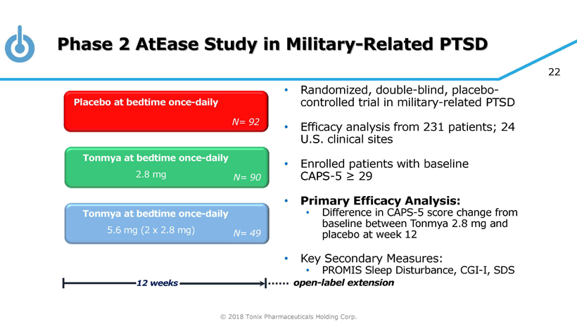 © 2018 Tonix Pharmaceuticals Holding Corp. 21 Growing Economic and Social Burden to Care for Veterans with PTSD Health care costs associated with PTSD for OEF/OIF/OND veterans: Direct costs Indirect costs 1 CBO Report 2012; 2 Tanielan , Invisible Wounds of War . 2005; 3 Analysis of VA Health Care Utilization among Operation Enduring Freedom, Operation Iraqi Freedom, and Operation New Dawn Veterans, from 1st Qtr FY 2002 through 2nd Qtr FY 2015, Washington, DC ; OEF/OIF/OND, Operations Enduring Freedom, Iraqi Freedom and New Dawn. $3,000 - 5,000 per patient per year for OEF/OIF Veterans 1 ~ 1.9M Veterans out of 2.7M Service members deployed between 10/1/2001 and 3/31/2015 3 $2 - 3 billion estimated yearly cost to society 2 Families, social care agencies, schools, employers, welfare system 2