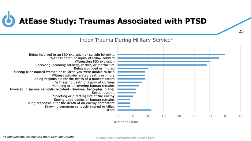 © 2018 Tonix Pharmaceuticals Holding Corp. 24 AtEase Study Demographics and Characteristics 93% of the randomized patients were male 98% had trauma during military service Deployed an average of 2.3 times Mean time since index trauma was 7 years Race and ethnicity generally consistent with U.S. military distribution Similar baseline CAPS - 5 scores and MADRS 1 scores across treatment arms Current Major Depressive Disorder 14% by MINI 7.0 2 1 MADRS, Montgomery - Åsberg Depression Rating Scale 2 MINI 7.0, Mini - International Neuropsychiatric Interview, Version 7
