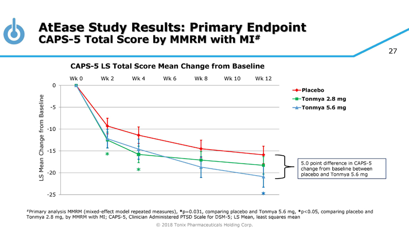 © 2018 Tonix Pharmaceuticals Holding Corp. 26 AtEase Study – Summary of Primary and Secondary Analyses (week 12)