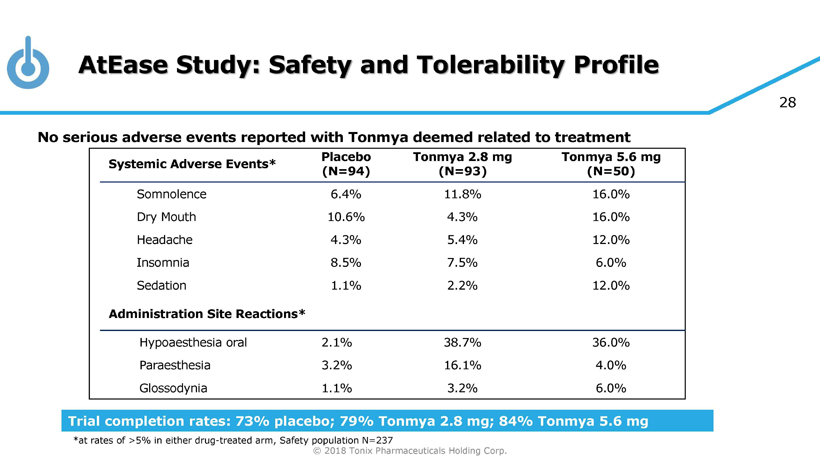 © 2018 Tonix Pharmaceuticals Holding Corp. 27 AtEase Study Results: Primary Endpoint CAPS - 5 Total Score by MMRM with MI # -25 -20 -15 -10 -5 0 Wk 0 Wk 2 Wk 4 Wk 6 Wk 8 Wk 10 Wk 12 Placebo Tonmya 2.8 mg Tonmya 5.6 mg * # Primary analysis MMRM (mixed - effect model repeated measures), * p=0.031, comparing placebo and Tonmya 5.6 mg, * p<0.05, comparing placebo and Tonmya 2.8 mg, by MMRM with MI; CAPS - 5, Clinician Administered PTSD Scale for DSM - 5; LS Mean, least squares mean * * CAPS - 5 LS Total Score Mean Change from Baseline 5.0 point difference in CAPS - 5 change from baseline between placebo and Tonmya 5.6 mg LS Mean Change from Baseline