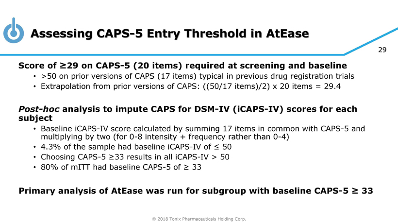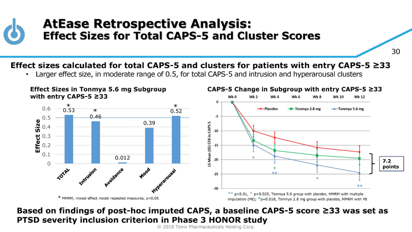 © 2018 Tonix Pharmaceuticals Holding Corp. 29 Assessing CAPS - 5 Entry Threshold in AtEase Score of ≥29 on CAPS - 5 (20 items) required at screening and baseline • >50 on prior versions of CAPS (17 items) typical in previous drug registration trials • Extrapolation from prior versions of CAPS: ((50/17 items)/2) x 20 items = 29.4 Post - hoc analysis to impute CAPS for DSM - IV ( iCAPS - IV) scores for each subject • Baseline iCAPS - IV score calculated by summing 17 items in common with CAPS - 5 and multiplying by two (for 0 - 8 intensity + frequency rather than 0 - 4) • 4.3% of the sample had baseline iCAPS - IV of ≤ 50 • Choosing CAPS - 5 ≥33 results in all iCAPS - IV > 50 • 80% of mITT had baseline CAPS - 5 of ≥ 33 Primary analysis of AtEase was run for subgroup with baseline CAPS - 5 ≥ 33