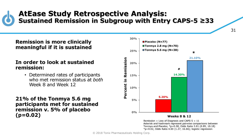 © 2018 Tonix Pharmaceuticals Holding Corp. 30 0.53 0.46 0.012 0.39 0.52 0 0.1 0.2 0.3 0.4 0.5 0.6 Effect Size AtEase Retrospective Analysis: Effect Sizes for Total CAPS - 5 and Cluster Scores * MMRM, mixed - effect model repeated measures, p<0.05 Effect sizes calculated for total CAPS - 5 and clusters for patients with entry CAPS - 5 ≥33 • Larger effect size, in moderate range of 0.5, for total CAPS - 5 and intrusion and hyperarousal clusters * * * Based on findings of post - hoc imputed CAPS, a baseline CAPS - 5 score ≥33 was set as PTSD severity inclusion criterion in Phase 3 HONOR study 7.2 points ** p<0.01, * p<0.025, Tonmya 5.6 group with placebo, MMRM with multiple imputation (MI); * p=0.018, Tonmya 2.8 mg group with placebo, MMRM with MI Effect Sizes in Tonmya 5.6 mg Subgroup with entry CAPS - 5 ≥33 CAPS - 5 Change in Subgroup with entry CAPS - 5 ≥33
