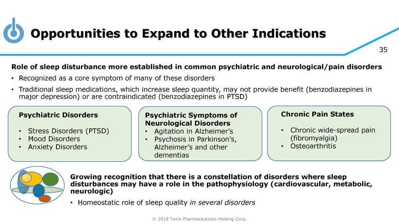 © 2018 Tonix Pharmaceuticals Holding Corp. 34 Tonmya Trazodone Trazodone (disordered sleep ), prazosin (night terrors) - Trazodone inhibits serotonin 5HT 2a receptors and serotonin reuptake (SARI) - Prazosin blocks norepinephrine α 1 receptors Prazosin SARI – S erotonin Receptor A ntagonist & R euptake I nhibitor (Stahl SM, CNS Spectrums, 2009;14:536).