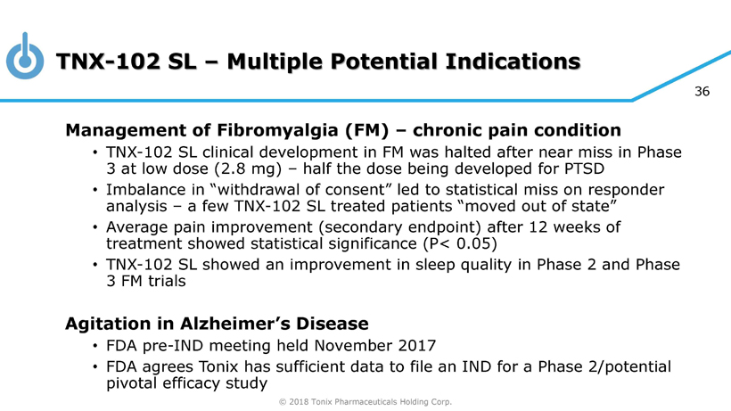 © 2018 Tonix Pharmaceuticals Holding Corp. 35 v Opportunities to Expand to Other Indications Growing recognition that there is a constellation of disorders where sleep disturbances may have a role in the pathophysiology (cardiovascular, metabolic, neurologic) • Homeostatic role of sleep quality in several disorders Psychiatric Disorders • Stress Disorders (PTSD) • Mood Disorders • Anxiety Disorders Chronic Pain States • Chronic wide - spread pain (fibromyalgia) • Osteoarthritis Role of sleep disturbance more established in common psychiatric and neurological/pain disorders • Recognized as a core symptom of many of these disorders • Traditional sleep medications, which increase sleep quantity, may not provide benefit (benzodiazepines in major depression) or are contraindicated (benzodiazepines in PTSD) v Psychiatric Symptoms of Neurological Disorders • Agitation in Alzheimer’s • Psychosis in Parkinson’s, Alzheimer’s and other dementias