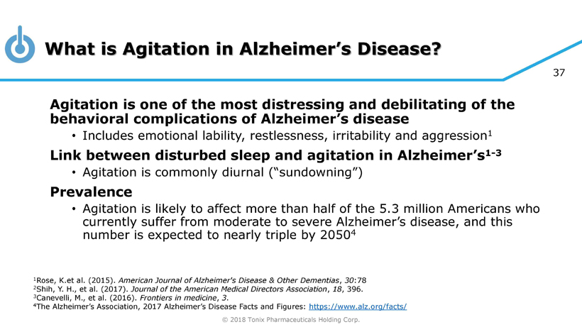 © 2018 Tonix Pharmaceuticals Holding Corp. 36 TNX - 102 SL – Multiple Potential Indications Management of Fibromyalgia (FM) – chronic pain condition • TNX - 102 SL clinical development in FM was halted after near miss in Phase 3 at low dose (2.8 mg) – half the dose being developed for PTSD • Imbalance in “withdrawal of consent” led to statistical miss on responder analysis – a few TNX - 102 SL treated patients “moved out of state” • Average pain improvement (secondary endpoint) after 12 weeks of treatment showed statistical significance (P< 0.05) • TNX - 102 SL showed an improvement in sleep quality in Phase 2 and Phase 3 FM trials Agitation in Alzheimer’s Disease • FDA pre - IND meeting held November 2017 • FDA agrees Tonix has sufficient data to file an IND for a Phase 2/potential pivotal efficacy study