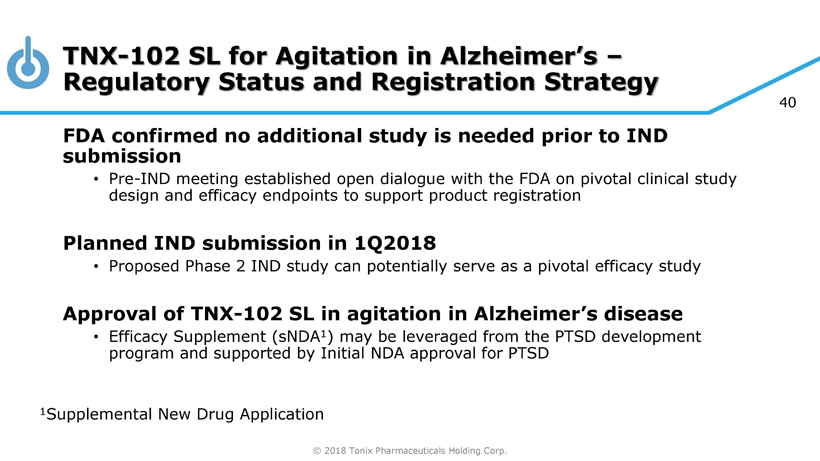 © 2018 Tonix Pharmaceuticals Holding Corp. 39 Agitation in Alzheimer’s Disease – Potential New Indication for TNX - 102 SL Successful pre - IND meeting in November, 2017 • IND planned 1Q2018 to support a Phase 2 efficacy study Significant unmet need • No FDA approved drugs for the treatment of agitation in Alzheimer’s Mechanism of improving sleep quality • Sleep disturbance is a significant and common symptoms in Alzheimer’s Pharmacological advantages outweigh potential concerns of using TNX - 102 SL in treating agitation in Alzheimer’s disease • Blocks 3 receptors, not just one (e.g., 5 - HT 2A ) • Anti - muscarinic (M1) effect in patients on anticholinergics (e.g., donepezil and rivastigmine) possibly reduced with lower sublingual dose