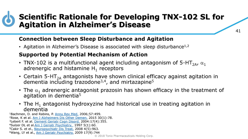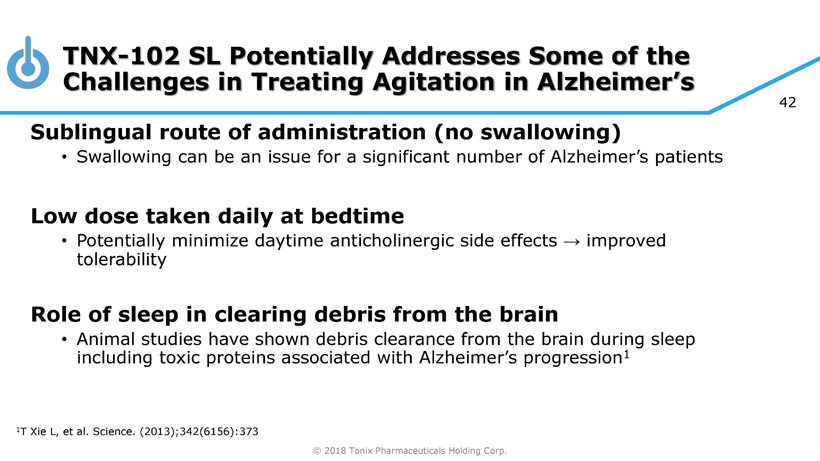 © 2018 Tonix Pharmaceuticals Holding Corp. 41 Scientific Rationale for Developing TNX - 102 SL for Agitation in Alzheimer’s Disease Connection between Sleep Disturbance and Agitation • Agitation in Alzheimer’s Disease is associated with sleep disturbance 1,2 Supported by Potential Mechanism of Action • TNX - 102 is a multifunctional agent including antagonism of 5 - HT 2A , a 1 adrenergic and histamine H 1 receptors • Certain 5 - HT 2A antagonists have shown clinical efficacy against agitation in dementia including trazodone 3,4 , and mirtazapine 5 • The a 1 adrenergic antagonist prazosin has shown efficacy in the treatment of agitation in dementia 5 • The H 1 antagonist hydroxyzine had historical use in treating agitation in dementia 1 Bachmen, D. and Rabins , P. Annu Rev Med. 2006;57:499. 2 Rose, K et al. Am J Alzheimers Dis Other Demen . 2015 30(1):78. 3 Lebert F. et al. Dement Geriatr Cogn Disord . 2004:17(4):355. 4 Sulzer DL et al. Am J Geriatr Psychiatry. 1997 5(1):60. 5 Cakir S. et el., Neuropsychiatr Dis Treat. 2008 4(5):963. 6 Wang, LY et al., Am J Geriatr Psychiatry. 2009 17(9):744