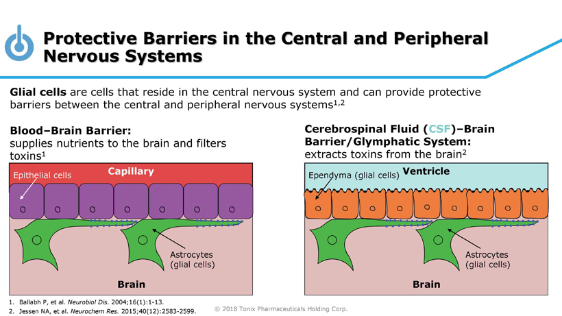 © 2018 Tonix Pharmaceuticals Holding Corp. Protective Barriers in the Central and Peripheral Nervous Systems Glial cells are cells that reside in the central nervous system and can provide protective barriers between the central and peripheral nervous systems 1,2 Blood – Brain Barrier: supplies nutrients to the brain and filters toxins 1 Cerebrospinal Fluid ( CSF ) – Brain Barrier/Glymphatic System: extracts toxins from the brain 2 Ventricle Brain Ependyma (glial cells) Astrocytes (glial cells) Capillary Brain Epithelial cells Astrocytes (glial cells) 1. Ballabh P, et al. Neurobiol Dis. 2004;16(1):1 - 13. 2. Jessen NA, et al. Neurochem Res. 2015;40(12):2583 - 2599.