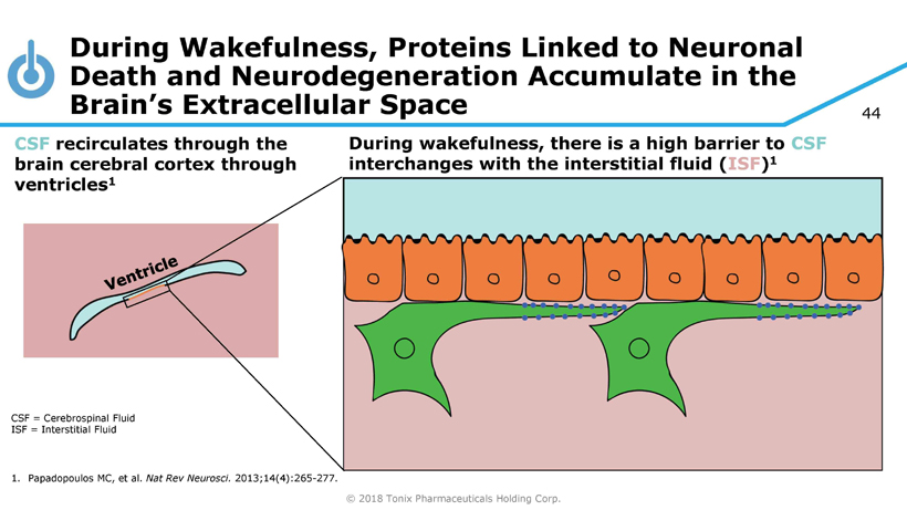 © 2018 Tonix Pharmaceuticals Holding Corp. 44 During Wakefulness, Proteins Linked to Neuronal Death and Neurodegeneration Accumulate in the Brain’s Extracellular Space CSF = Cerebrospinal Fluid ISF = Interstitial Fluid 1. Papadopoulos MC, et al. Nat Rev Neurosci . 2013;14(4):265 - 277. During wakefulness, there is a high barrier to CSF interchanges with the interstitial fluid ( ISF ) 1 CSF recirculates through the brain cerebral cortex through ventricles 1