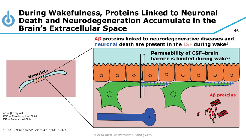 © 2018 Tonix Pharmaceuticals Holding Corp. 45 During Wakefulness, Proteins Linked to Neuronal Death and Neurodegeneration Accumulate in the Brain’s Extracellular Space AQP4 = A quaporin - 4 CSF = Cerebrospinal Fluid ISF = Interstitial Fluid 1. Papadopoulos MC, et al. Nat Rev Neurosci . 2013;14(4):265 - 277. Ependymal glial cells line the ventricle 1 AQP4 localized to astrocyte processes 1 Astrocytes surrounded by ISF near the CSF – brain barrier 1 The pathways of interchanging CSF and ISF depend on aquaporin - 4 ( AQP4 ) water channels on astrocytes 1