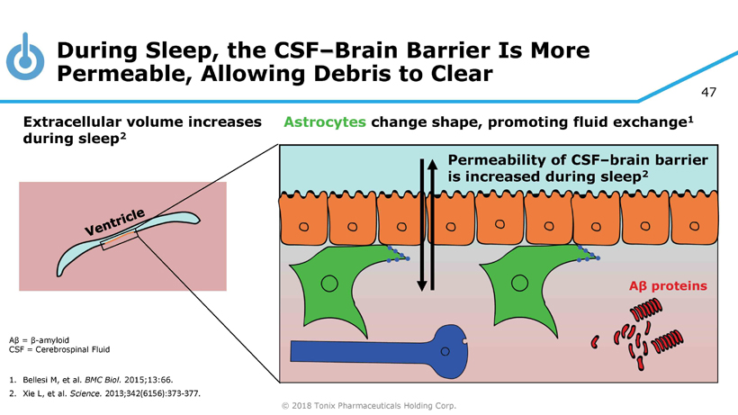 © 2018 Tonix Pharmaceuticals Holding Corp. 46 During Wakefulness, Proteins Linked to Neuronal Death and Neurodegeneration Accumulate in the Brain’s Extracellular Space Aβ = β - amyloid CSF = Cerebrospinal Fluid ISF = Interstitial Fluid 1. Xie L, et al. Science. 2013;342(6156):373 - 377. Permeability of CSF – brain barrier is limited during wake 1 A β proteins linked to neurodegenerative diseases and neuronal death are present in the ISF during wake 1