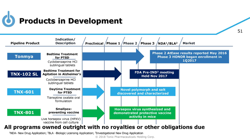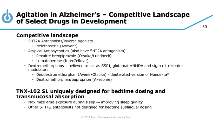 © 2018 Tonix Pharmaceuticals Holding Corp. 50 Agitation in Alzheimer’s – Competitive Landscape of Select Drugs in Development Competitive landscape • 5HT2A Antagonists/inverse agonists • Nelotanserin ( Axovant ) • Atypical Antip sychotics (also have 5HT2A antagonism) • Rexulti ® brexpiprazole (Otsuka/ Lundbeck ) • Lumateperone ( InterCellular ) • Dextromethorphans – believed to act as SSRI, glutamate/NMDA and sigma - 1 receptor modulators • Deudextromethorphan ( Avenir /Otsuka) - deuterated version of Nuedexta ® • Dextromethorphan/ buproprion ( Axesome ) TNX - 102 SL uniquely designed for bedtime dosing and transmucosal absorption • Maximize drug exposure during sleep → improving sleep quality • Other 5 - HT 2A antagonists not designed for bedtime sublingual dosing