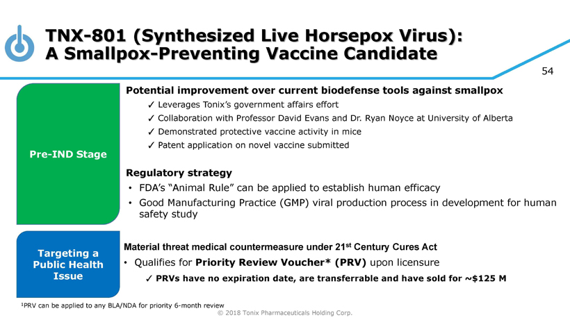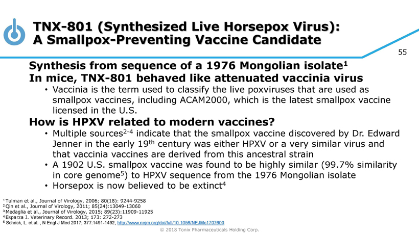 © 2018 Tonix Pharmaceuticals Holding Corp. 55 TNX - 801 (Synthesized Live Horsepox Virus): A Smallpox - Preventing Vaccine Candidate Synthesis from sequence of a 1976 Mongolian isolate 1 In mice, TNX - 801 behaved like attenuated vaccinia virus • Vaccinia is the term used to classify the live poxviruses that are used as smallpox vaccines, including ACAM2000, which is the latest smallpox vaccine licensed in the U.S. How is HPXV related to modern vaccines? • Multiple sources 2 - 4 indicate that the smallpox vaccine discovered by Dr. Edward Jenner in the early 19 th century was either HPXV or a very similar virus and that vaccinia vaccines are derived from this ancestral strain • A 1902 U.S. smallpox vaccine was found to be highly similar (99.7% similarity in core genome 5 ) to HPXV sequence from the 1976 Mongolian isolate • Horsepox is now believed to be extinct 4 1 Tulman et al., Journal of Virology, 2006; 80(18): 9244 - 9258 2 Qin et al., Journal of Virology, 2011; 85(24):13049 - 13060 3 Medaglia et al., Journal of Virology, 2015; 89(23):11909 - 11925 4 Esparza J. Veterinary Record. 2013; 173: 272 - 273 5 Schrick, L. et al. , N Engl J Med 2017; 377:1491 - 1492, http://www.nejm.org/doi/full/10.1056/NEJMc1707600