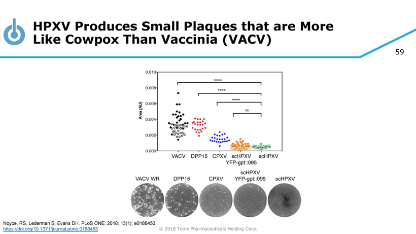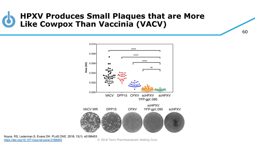 59 © 2018 Tonix Pharmaceuticals Holding Corp. HPXV Produces Small Plaques that are More Like Cowpox Than Vaccinia (VACV) Noyce, RS, Lederman S, Evans DH. PLoS ONE. 2018; 13(1): e0188453 https://doi.org/10.1371/journal.pone.0188453