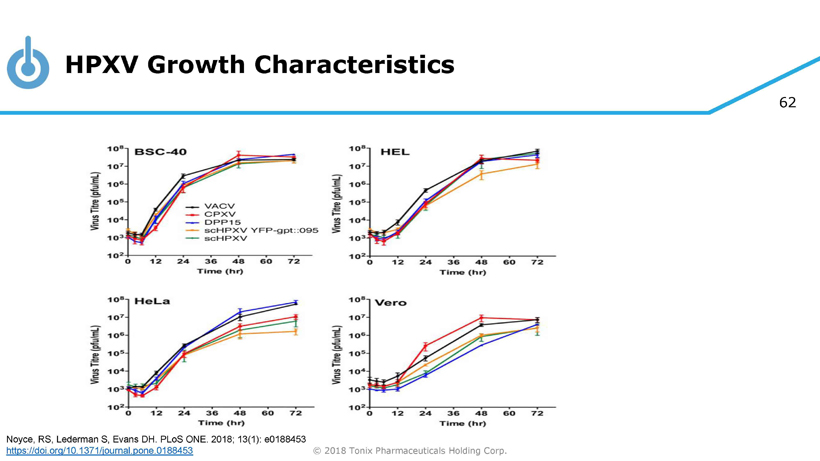 62 © 2018 Tonix Pharmaceuticals Holding Corp. HPXV Growth Characteristics Noyce, RS, Lederman S, Evans DH. PLoS ONE. 2018; 13(1): e0188453 https://doi.org/10.1371/journal.pone.0188453