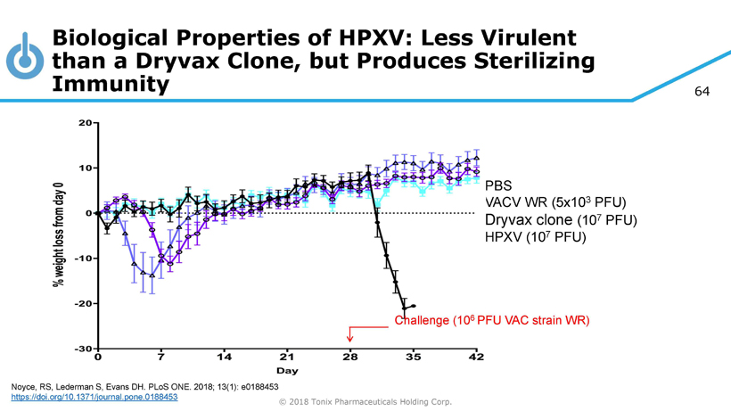 63 © 2018 Tonix Pharmaceuticals Holding Corp. Testing Vaccine Protective Activity of HPXV in Mice Model Noyce, RS, Lederman S, Evans DH. PLoS ONE. 2018; 13(1): e0188453 https://doi.org/10.1371/journal.pone.0188453