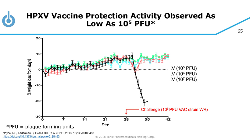 64 © 2018 Tonix Pharmaceuticals Holding Corp. PBS VACV WR (5x10 3 PFU) Dryvax clone (10 7 PFU) HPXV (10 7 PFU) Challenge (10 6 PFU VAC strain WR) Biological Properties of HPXV: Less Virulent than a Dryvax Clone, but Produces Sterilizing Immunity Noyce, RS, Lederman S, Evans DH. PLoS ONE. 2018; 13(1): e0188453 https://doi.org/10.1371/journal.pone.0188453