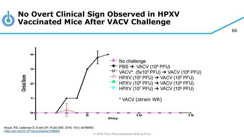 65 © 2018 Tonix Pharmaceuticals Holding Corp. PBS HPXV (10 5 PFU) HPXV (10 6 PFU) HPXV (10 7 PFU) Challenge (10 6 PFU VAC strain WR) HPXV Vaccine Protection Activity Observed As Low As 10 5 PFU* *PFU = plaque forming units Noyce, RS, Lederman S, Evans DH. PLoS ONE. 2018; 13(1): e0188453 https://doi.org/10.1371/journal.pone.0188453