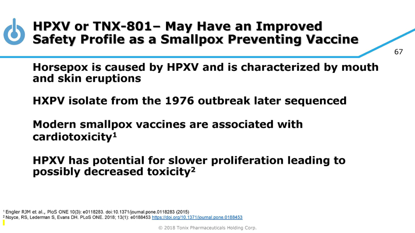 66 © 2018 Tonix Pharmaceuticals Holding Corp. No challenge PBS ➔ VACV (10 6 PFU) VACV* (5x10 3 PFU) ➔ VACV (10 6 PFU) HPXV (10 5 PFU) ➔ VACV (10 6 PFU) HPXV (10 6 PFU) ➔ VACV (10 6 PFU) HPXV (10 7 PFU) ➔ VACV (10 6 PFU) * VACV (strain WR) No Overt Clinical Sign Observed in HPXV Vaccinated Mice After VACV Challenge Noyce, RS, Lederman S, Evans DH. PLoS ONE. 2018; 13(1): e0188453 https://doi.org/10.1371/journal.pone.0188453