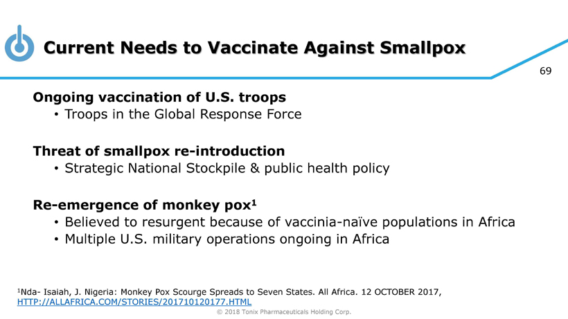 © 2018 Tonix Pharmaceuticals Holding Corp. 68 An Improved Smallpox - Preventing Vaccine is Important and Necessary for a Potential Public Health Issue Smallpox was eradicated as a result of global public health campaigns No cases of naturally - occurring smallpox have been reported since 1977 Accidental or intentional transmission of smallpox does not require a natural reservoir Stockpiles of smallpox - preventing vaccines are currently maintained and refreshed in case of need