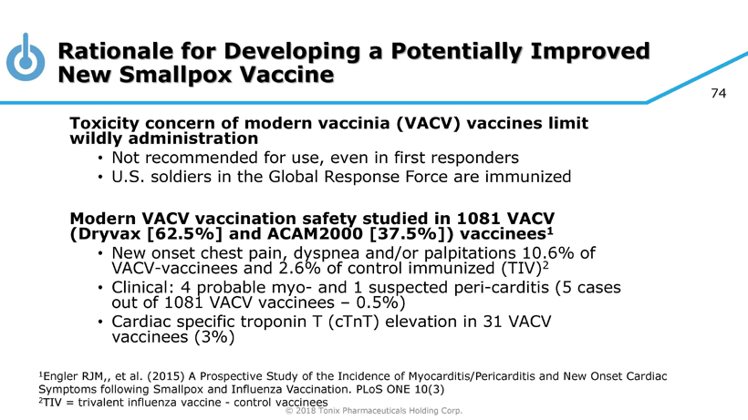 © 2018 Tonix Pharmaceuticals Holding Corp. 73 Single clone picked from “swarm” of Dryvax ® 1 • Some rationale for selection 2 Growth in serum free Vero cells • Eliminates risk of Bovine Spongiform Encephalopathy (BSE)/prion contamination – safety concerns in Wyeth’s Dryvax (grown in calf lymph) In 2000, the evolutionary connection between vaccinia and horsepox was not understood • Tulman’s sequence of horsepox was published in 2006 3 ACAM2000 1 – Best Technology of its Time 1 US licensed smallpox preventing vaccine – ACAM2000 is currently marketed, Dryvax has been withdrawn from marketing 2 Monath, TP et al. Int. J. of Inf. Dis. (2004) 8S2:S31 3 Tulman, ER. Genome of Horsepox Virus J. Virol. (2006) 80(18) 9244
