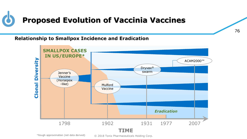 © 2018 Tonix Pharmaceuticals Holding Corp. 75 Postulated Divergence of Historical Strains of Vaccinia Proposed Evolution of Vaccinia Vaccines NYCBH/European precursor stocks Horsepox - like ancestral strain Lister/Evans/USSR Dryvax ® IHD - J WR Copenhagen Tashkent RPXV TianTan Ankara LIVP IHD - J=International Health Department - Japan LIVP=Lister Vaccine Strain NYCBH=New York City Board of Health RPXV=Rabbitpox Virus WR=Western Reserve Figure Adapted from Qin et al. Journal of Virology. 2015;89(3):1809 - 1824.