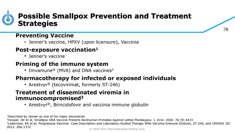 © 2018 Tonix Pharmaceuticals Holding Corp. 77 Theoretical effectiveness of modern vaccinia vaccines are based on extrapolation from older vaccines • Newer/modern vaccines were not widely used when smallpox was endemic MVA ( Modified Virus Ankara) which has large deletions also produces different T cell responses • In non - human primates, MVA is less effective than ACAM2000 in protecting against monkeypox 1 • MVA has fewer epitopes, and elicits different responses to existing epitopes 2 • MVA effectiveness argument is based on the immune response to intracellular mature virus (IMV) • Immunity to the other form of virus, extracellular enveloped virus (EEV), is weak because the immunodominant B5 gene is heavily mutated and deleted in MVA What’s the Evidence of Effectiveness of Smallpox Vaccines for Preventing Smallpox? 1 Golden JW, et al. (2012). PLoS ONE 7(7): e42353. doi:10.1371/journal.pone.0042353 2 Tscharke, DC et al., J. Exp. Med. 2005 201(1):95