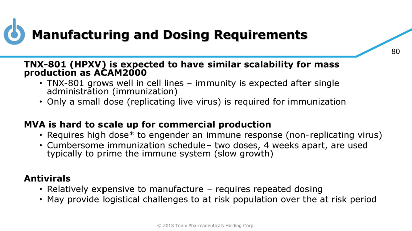 © 2018 Tonix Pharmaceuticals Holding Corp. 79 Pox vaccines with low or no replication appear safer than vaccines replicate fast in human cells • Canarypox and Imvamune ® (Modified Virus Ankara/MVA) appear to have good tolerability • Relatively safe in immunocompromised hosts • Rapidly replicating modern vaccinia vaccines ( Dryvax ® and ACAM2000®) are associated with myocarditis Replication correlates positively with immunogenicity • Jenner’s vaccine and modern vaccinia engender strong immunity • Canarypox and MVA appear to be weak immunogens, suitable for priming of the immune system in healthy human being and potentially safe enough to use in immunocompromised people Viral Replication Proficiency is Critical to Human Immunogenicity but May Compromise Safety